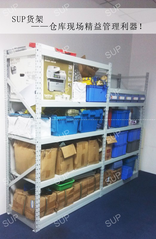 SUP为Space Saving、Utilization Iproving和Protecting的缩写。该货架为新型中轻型货架,相比传统的中轻型货架,具备三大优点: Space Saving(节省货架立柱占用空间,可以提高仓库利用面积5%);Utilization Improving(货架利用率提高了10%左右);Protecting(能有效的保护产品,防止货品从侧面滑落到地面)。