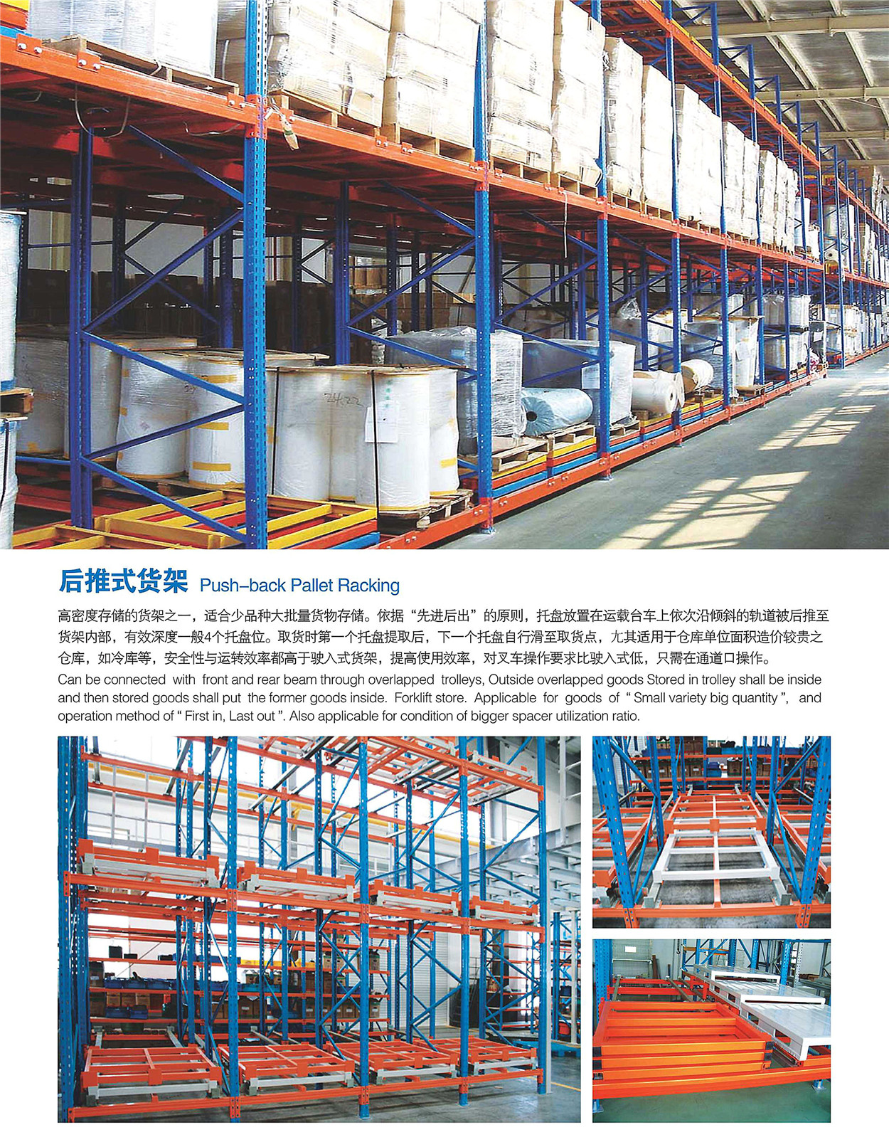 ★后退式货架节省空间,适合批量少,先进后出的情况。